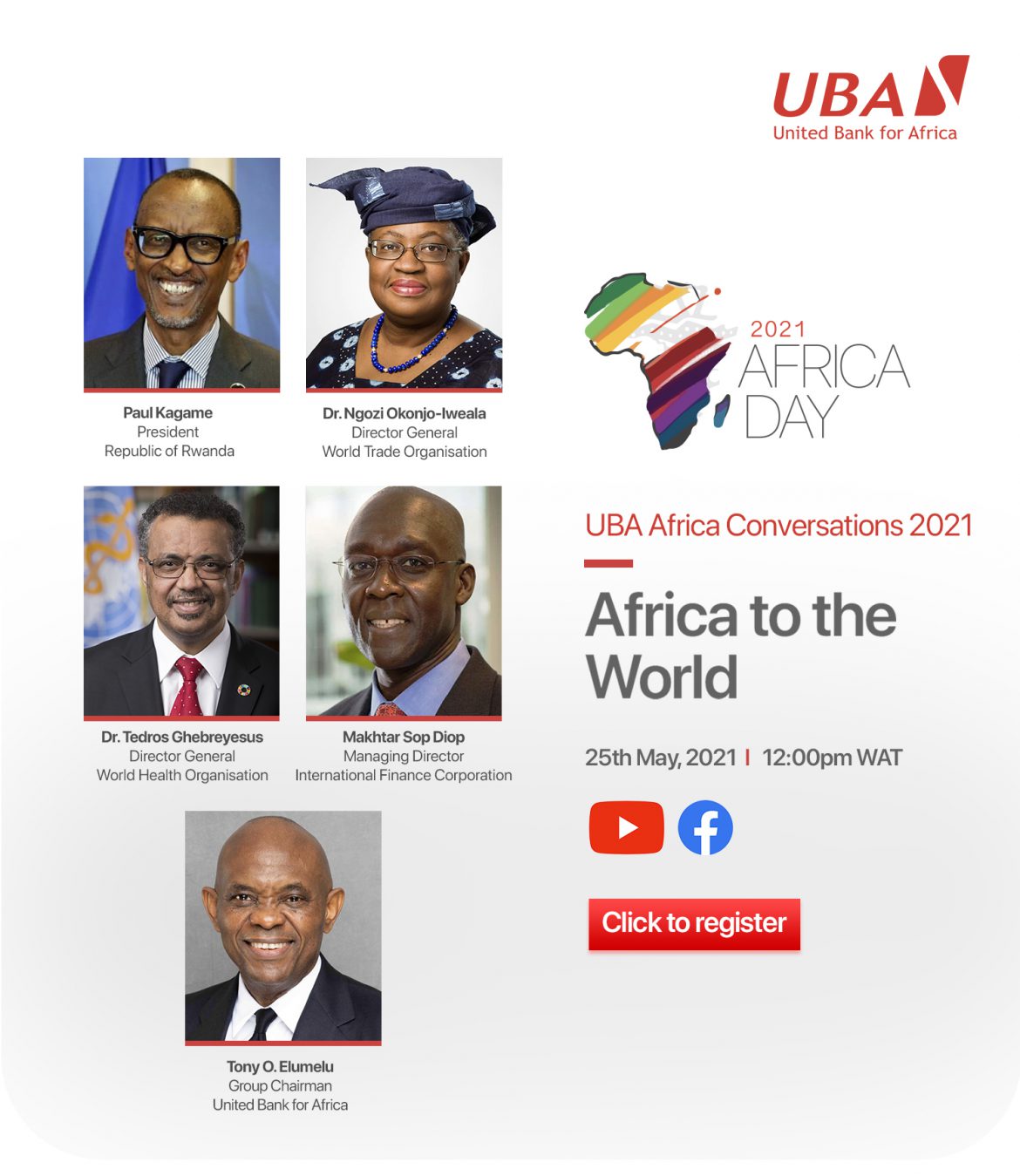 « UBA Africa Conversations 2021 » : Rejoignez les leaders africains mondiaux – Président Kagame du Rwanda, Ngozi Okonjo-Iweala de l’OMC, Tony O. Elumelu de UBA, Dr Tedros Adhanom Ghebreyesus de l’OMS, Makhtar Sop Diop de l’IFC, pour célébrer la Journée de l’Afrique lors des UBA’s Africa Conversations 2021.