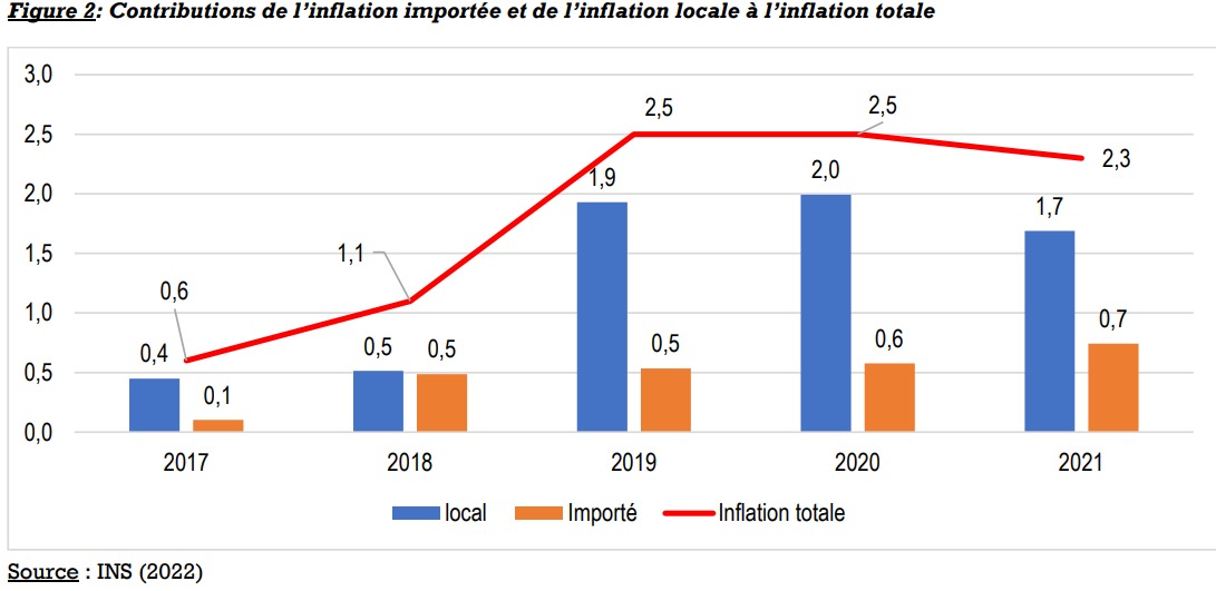 Selon le Minepat, « les données provisoires de janvier 2022, montrent que l’inflation a atteint 3,3 % en un an à Yaoundé, et +2,9 % à Douala, après respectivement +1,5% et +2,1% à la période correspondante de 2021. Il faut davantage craindre cette hausse potentielle des prix domestiques d’autant plus que la contribution de l’inflation importée à l’inflation nationale est croissante depuis 2017. »