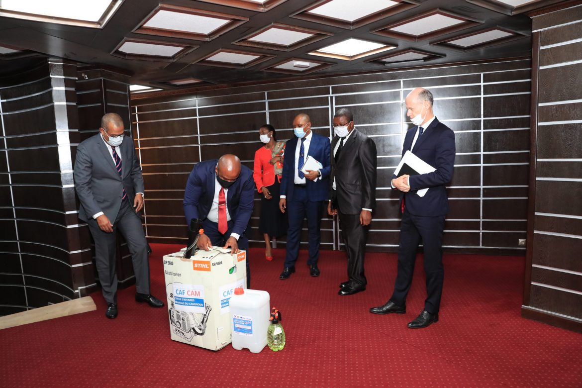 Ce premier don constitué de 20 000 litres de solutions hydro alcooliques, produites par le Groupe SABC, Total Cameroun, le Groupe CFAO et SOCUCAM, marque la première étape d’une série d’actions qui se dérouleront dans les institutions sanitaires de Yaoundé, Douala et Bafoussam, déclarés centres COVID-19, par le ministère de la Santé publique. Egalement dans ce package, 20 atomiseurs motorisés de marque STIHL/CAMCI, 200 kits sanitaires composés de fût fontaine, savons, sceau et masques chirurgicaux, des lampes solaires à destination des établissements de santé, des masques et autres protections à destination des institutions sanitaires, des visières de protection à destination des institutions sanitaires, des masques en tissu à destination du grand public, apprend-on des sources officielles de CCEF et CAFCAM.