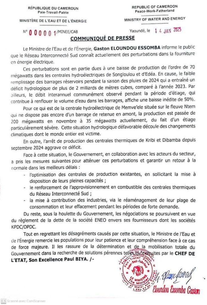 Dans un communiqué rendu public le 14 janvier, Gaston Eloundou Essomba, le ministre de l’Eau et de l’énergie justifie les raisons des coupures intempestives de l’énergie électrique. Les arguments contenus dans ce documents sont les mêmes depuis 2022.