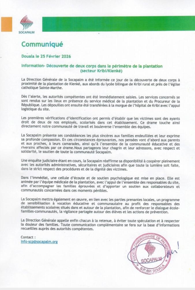 Le silence pèse désormais sur les plantations de la Socapalm en ce mercredi 25 février 2026. L’entreprise traverse une épreuve qui dépasse les bilans comptables et les cycles de production. La découverte de deux corps sans vie à la lisière du secteur Kribi-Kienké, non loin du lycée bilingue de Kribi rural et de l’église Sainte-Marthe, plonge l’ensemble des structures productives dans un état de recueillement. Ce n’est plus de l’économie de la matière première dont il est question aujourd’hui, mais de la perte de membres de la famille élargie du géant de l’huile de palme au Cameroun.