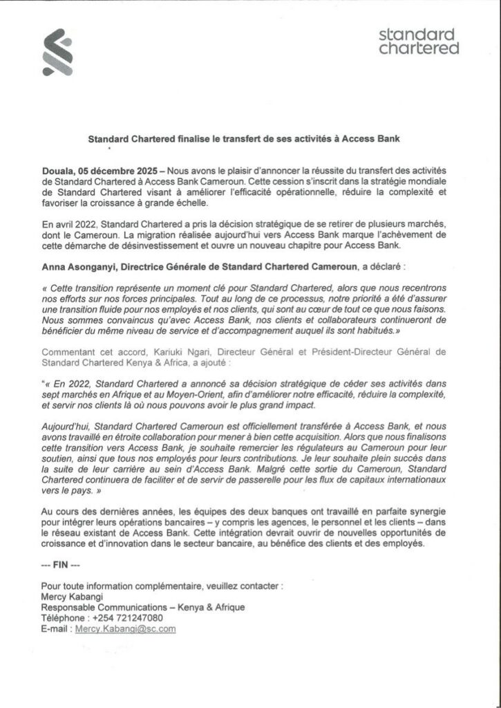 A la une Standard Chartered finalise le transfert de ses activités à Access Bank by EDC 5 décembre 2025 written by EDC 5 décembre 2025 0 comment [Communiqué de presse] Nous Suivre sur Notre Chaine Whatsapp Share Share Post Whatsapp Print Messenger Telegram Email access bankafrique économieéconomieéconomie africainestandard chartered bank Share EDC previous post Innovations, apport de la douane, emprunts extérieurs, mesures sociales fortes, grandes dépenses hors principal de la dette, recettes internes, les grands chiffres du projet de budget de l’Etat en 2026 next post Enquête : comment l’orpaillage et la déforestation accélèrent la crise climatique à l’Est Cameroun You may also like Enquête : comment l’orpaillage et la déforestation accélèrent la crise climatique à l’Est Cameroun 5 décembre 2025 Rencontre économique à la BVMAC : comment investir différemment dans l’immobilier et sur le marché... 12 mai 2025 Situation financière très dégradée, fiabilité des comptes incertaine, plan de restructuration faiblement exécuté, ALUCAM... 12 avril 2025 Banque Atlantique Cameroun / Atlantique assurances Cameroun : changement d’identité nominative et visuelle 4 mars 2025 Plus du digital, gratuité des actes de naissance, l’entrepreneuriat dans les programmes scolaires, suppression... 2 mars 2025 Joseph Dion Ngute : ‘’Les rencontres économiques du Cameroun’’ ne remplacent pas le Cameroon business... 26 février 2025 Leave a Comment Cancel Reply Save my name, email, and website in this browser for the next time I comment.