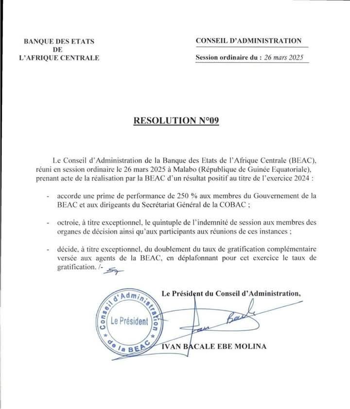 • La BEAC a choisi de verser des primes exceptionnelles à ses dirigeants (jusqu’à 250 %), de majorer les indemnités de ses administrateurs, et de doubler les gratifications de son personnel.